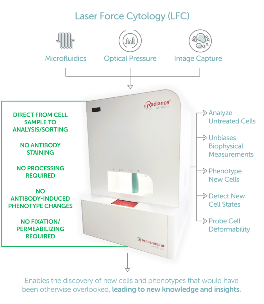 LumaCyte has addressed these challenges by creating an Ab-free analytical instrument, Radiance, which uses optical force to characterize cells. LFC uses a combination of optical pressure, microfluidics and imaging to sensitively interrogate the biophysical and biochemical properties of individual cells without the use of fluorescent labels or antibodies. Phenotypic changes, including cell differentiation (12) or the response of macrophages to bacterial spores (13) can be measured using optical force. Besides avoiding the time, costs and validation pitfalls associated with antibody use, a label-free approach ensures that cells are measured in their natural state and allows for an unbiased assessment of cell populations. In this context, the specificity of antibodies can be seen as a limitation: the antigenic changes they can measure are dictated by the antigen they target, and thus are biased by what is known. In contrast, an a priori label-free approach enables the discovery and characterization of new cells and phenotypes that could have been otherwise overlooked, leading to new knowledge and insights.