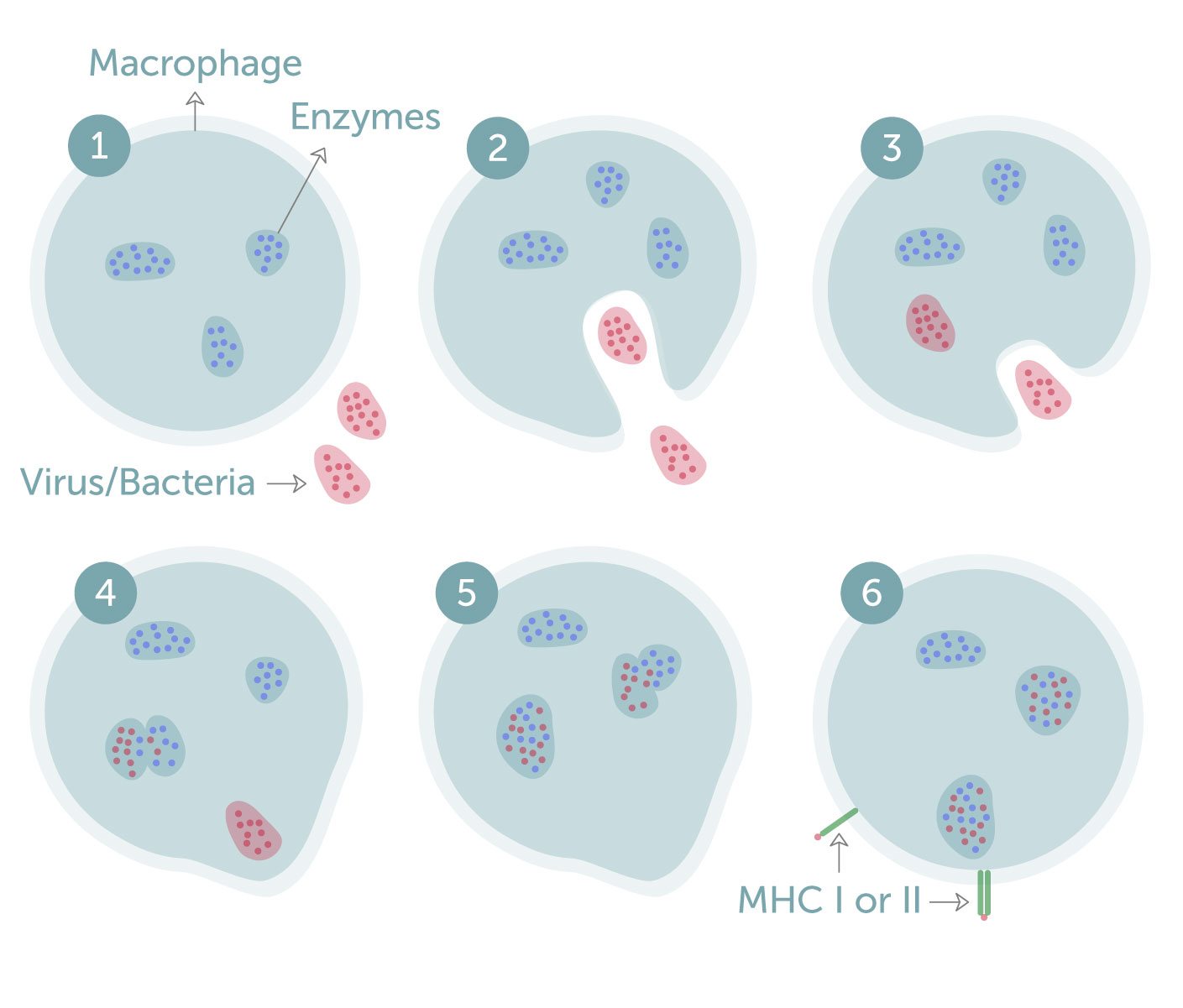 Figure 1. Phagocytosis in macrophages. The macrophage first engulfs the virus/bacteria (1-3), the virus/bacteria will then be broken down by the enzymes in the macrophage (4,5) and it is presented in the context of MHC I or II (6)