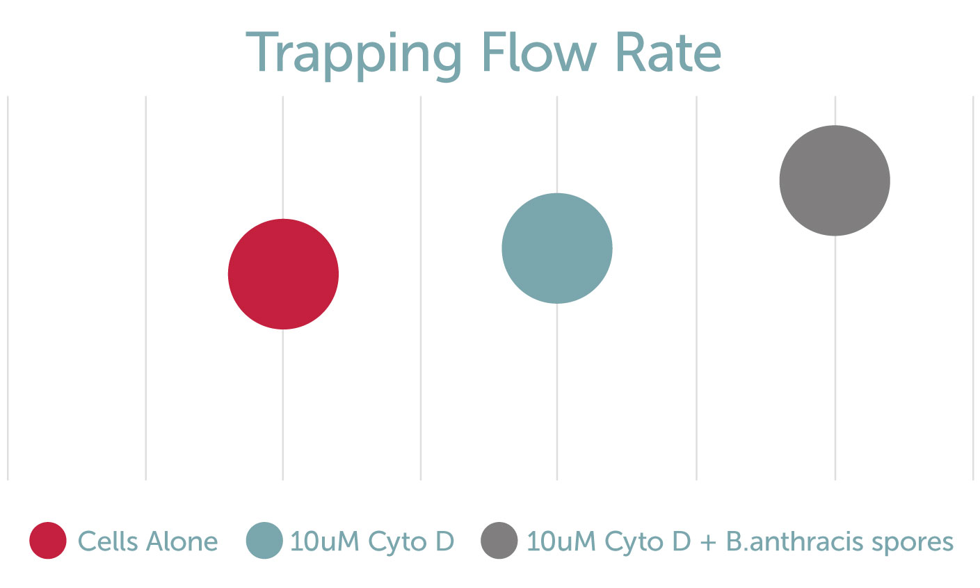 Figure 2. Measured trapping flow rate of macrophages (red) after they were treated with cytochalasin D (green), and were exposed to B.anthracis spores (gray)